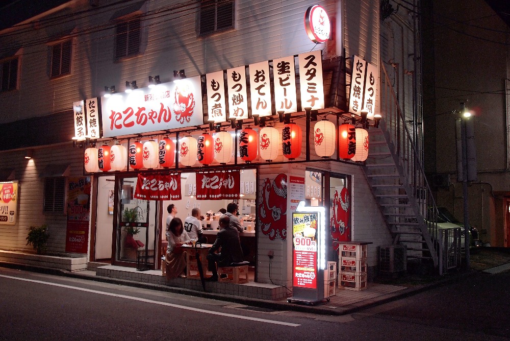 たこ焼き店「たこちゃん 駅前店」は屋台をイメージした賑やかな外観に。