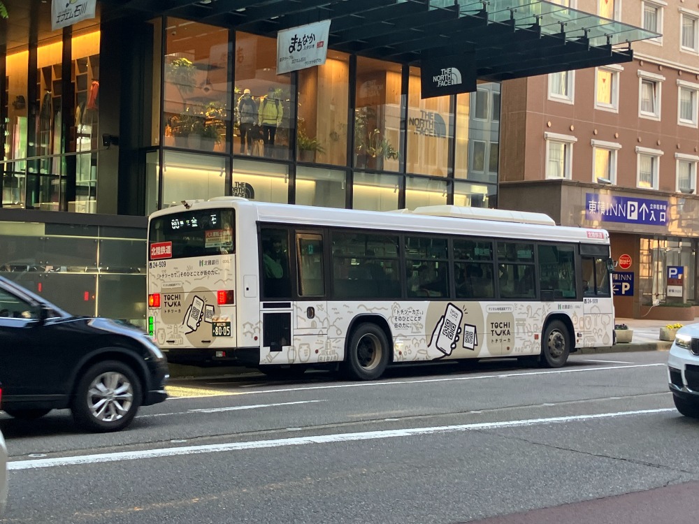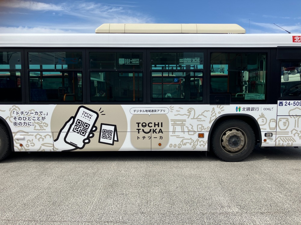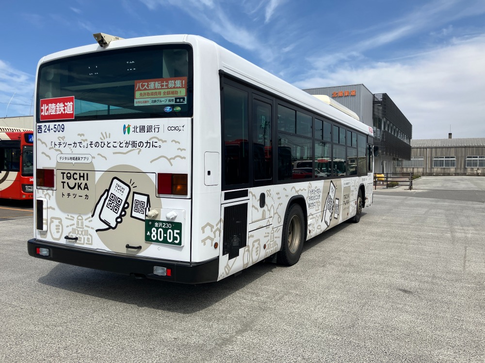 北國銀行様の決済アプリ「トチツーカ」のPRを目的としたラッピングバスの施工が完了し、運行が開始されました。金沢市中心部を走る北陸鉄道の路線バスを活用し、地域発の取り組みとして育まれてきた「トチツーカ」を、より多くの市民の日常へと届けていきます。