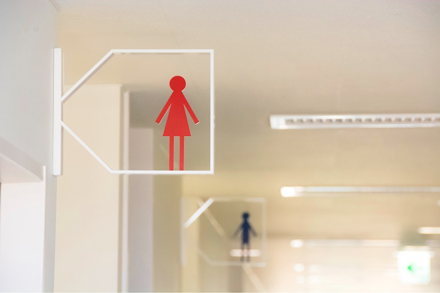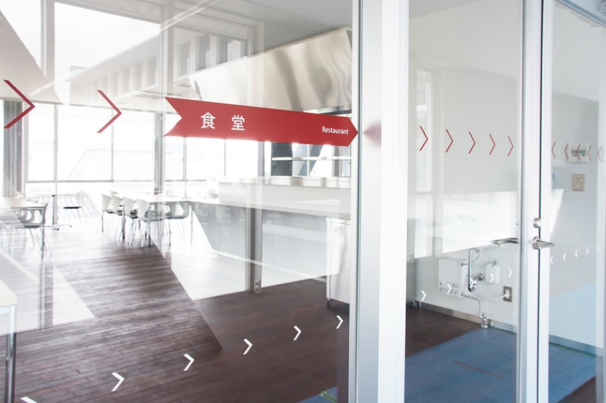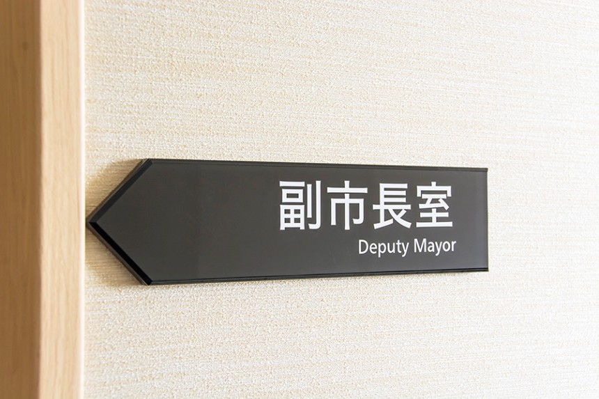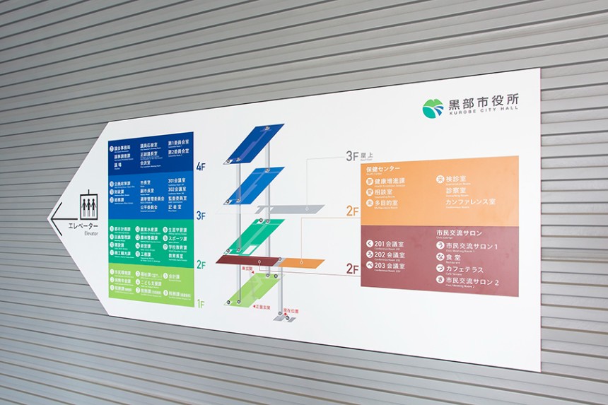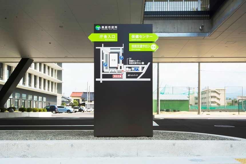 「名⽔の⾥」と呼ばれる富⼭県⿊部市庁舎のサイン計画。旧庁舎の近くに、多くの市⺠がかつて通っていた旧三⽇市⼩学校跡地への移転に加えて、保健センターおよび市⺠交流スペースとの⼀体整備が⾏われました。