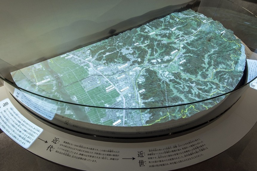 館内にはAR技術を⽤いた展⽰解説、ジオラマに映像投影するプロジェクションマッピング、昭和40年代に撮影された津幡町の写真のトンネルなど特徴的な仕掛けを施した展⽰を随所にデザインしています。