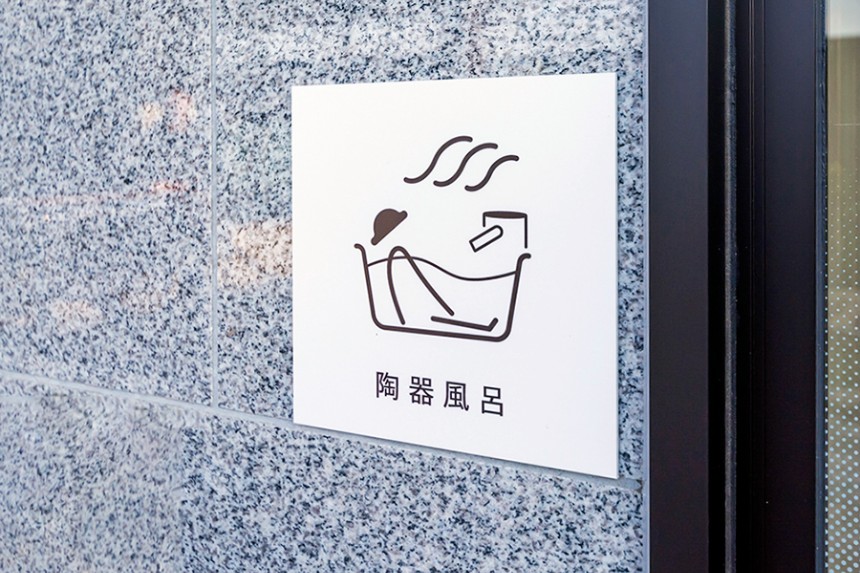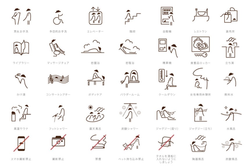 岩盤浴やサウナを始めとした様々なサービスを、館名から連想した⾵になびく形のオリジナルピクトグラムで表現し、より楽しさを感じる空間になるよう意識しています。