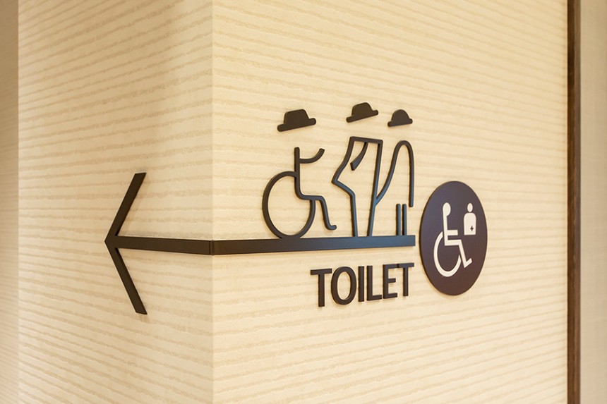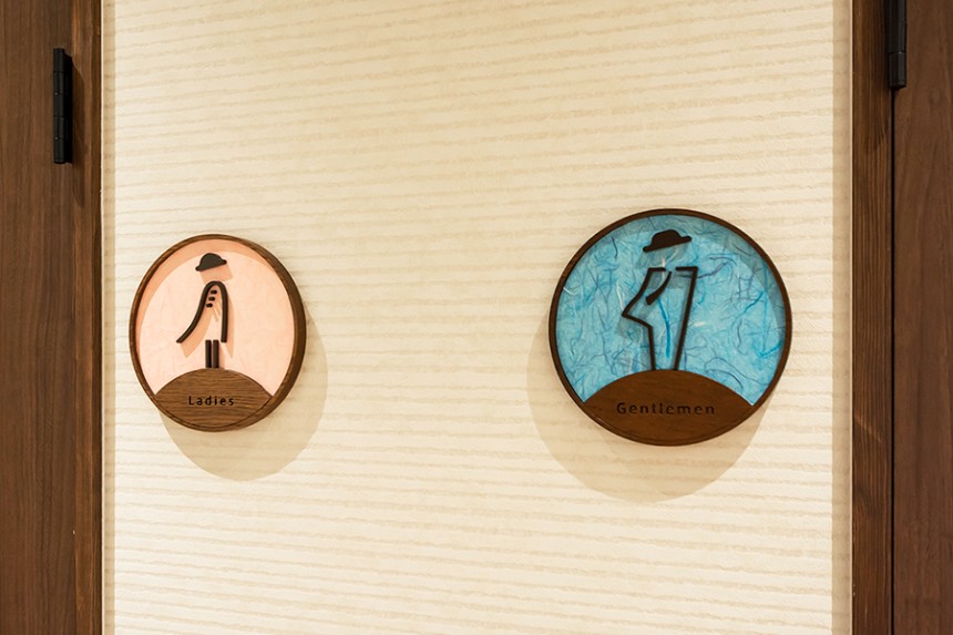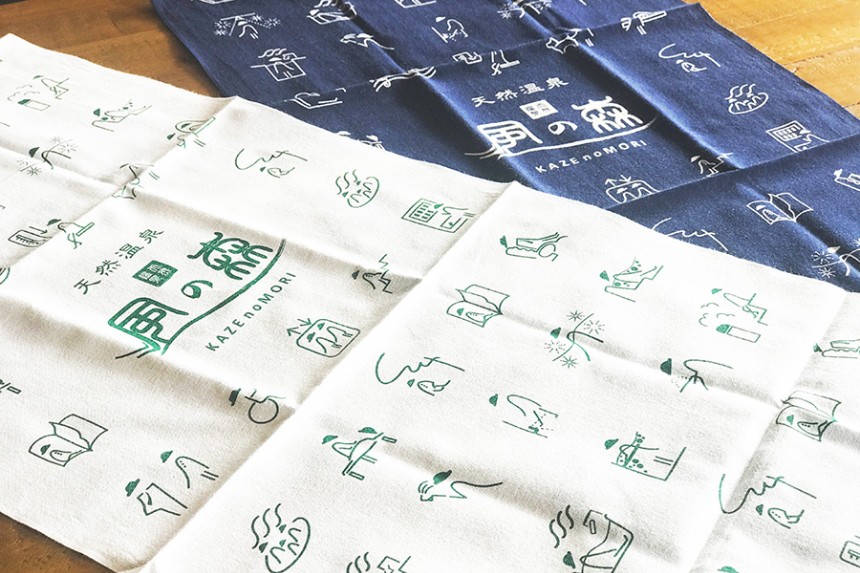 また、地域に根差す場を⽬指し、地場産業の五箇⼭和紙や⾼岡鋳物をサインに取り⼊れています。デザインしたオリジナルピクトグラムはスタッフとの打合せを重ねながら、Tシャツ・⼿ぬぐいといったグッズへの展開も⾏い、スタッフも⼀緒に施設を楽しむことが出来る場になりました。