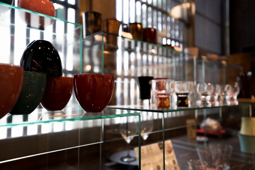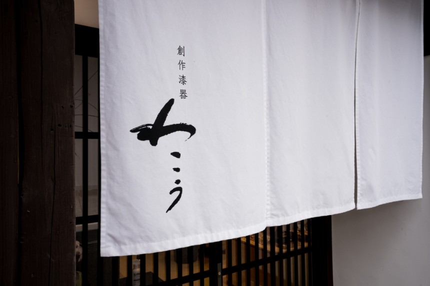 暗い木製の格子から覗く暖かな照明の色と、素朴でシンプルな白いのれんは、洗練されつつも温もりを感じる漆器作品たちを想起させるデザインとなっている。