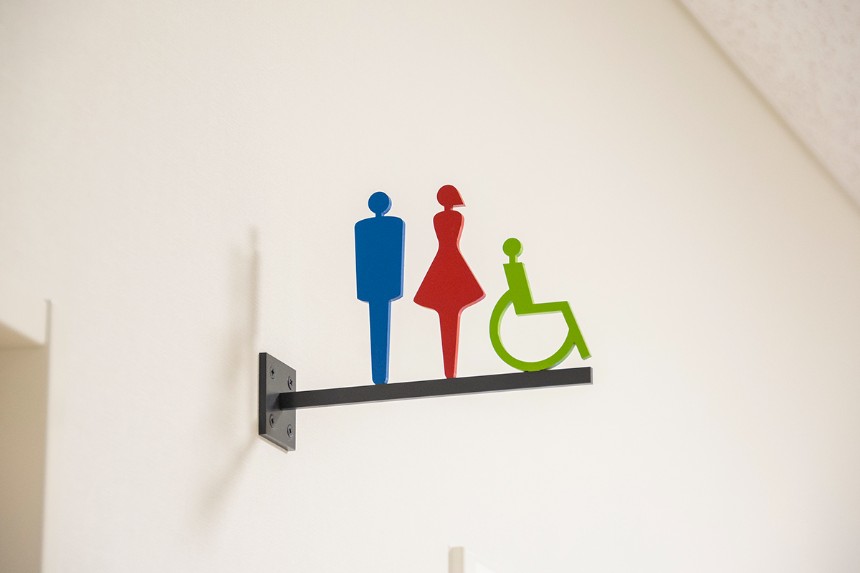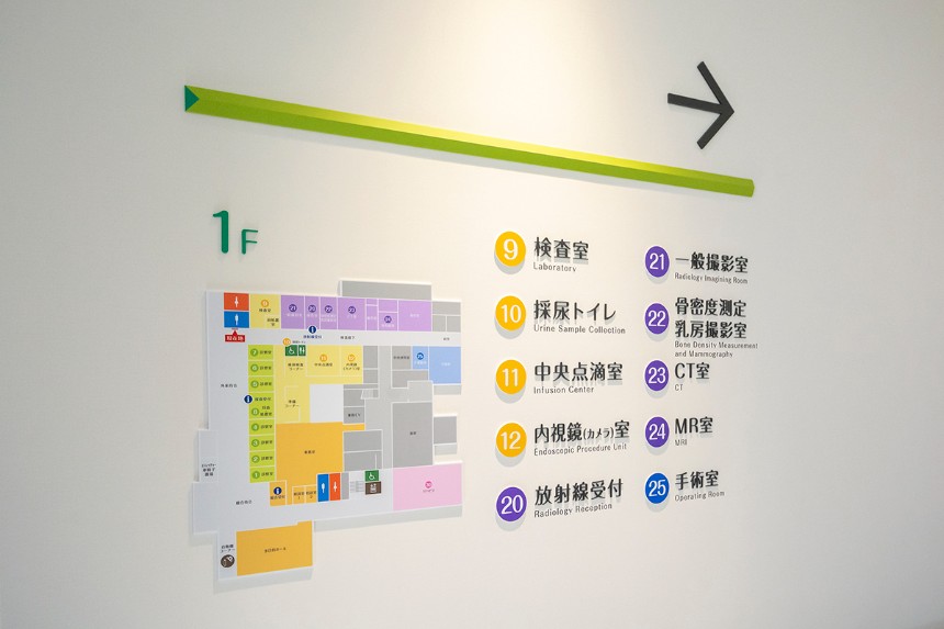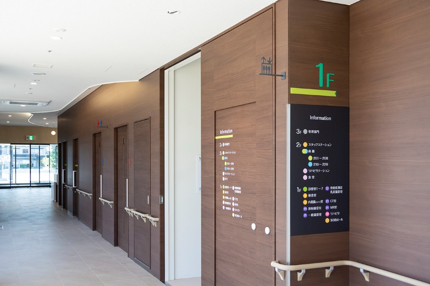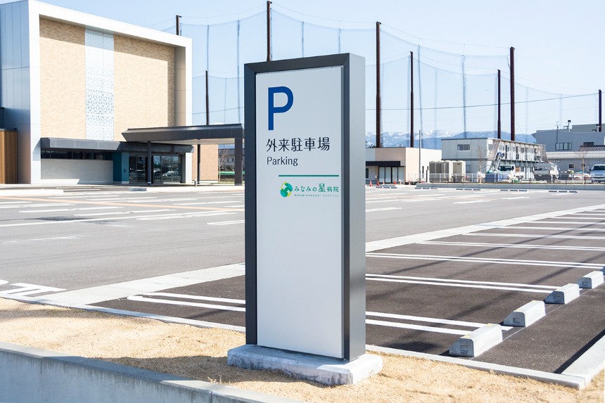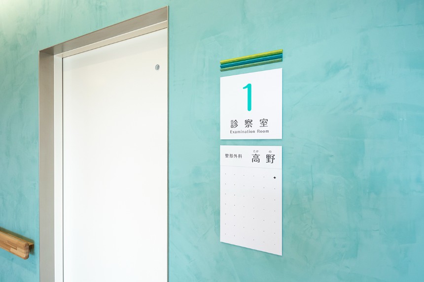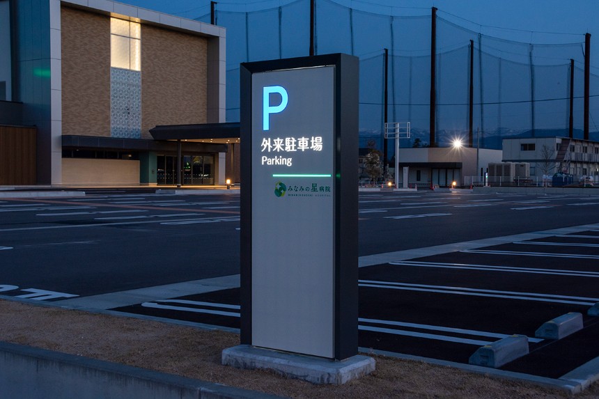 サインは全体的にシンプルな作りとし、ラインをモチーフとした病院全体のデザインと調和するデザインとしました。