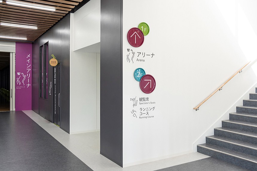 ユメックスアリーナ(塩尻市総合体育館)は、ガラス⾯を多く取り⼊れた建物が特徴的な、塩尻市のスポーツ⽂化の発信拠点となる施設です。当社では、施設内外のサインデザインから製作施⼯までを⼿掛けさせていただきました。