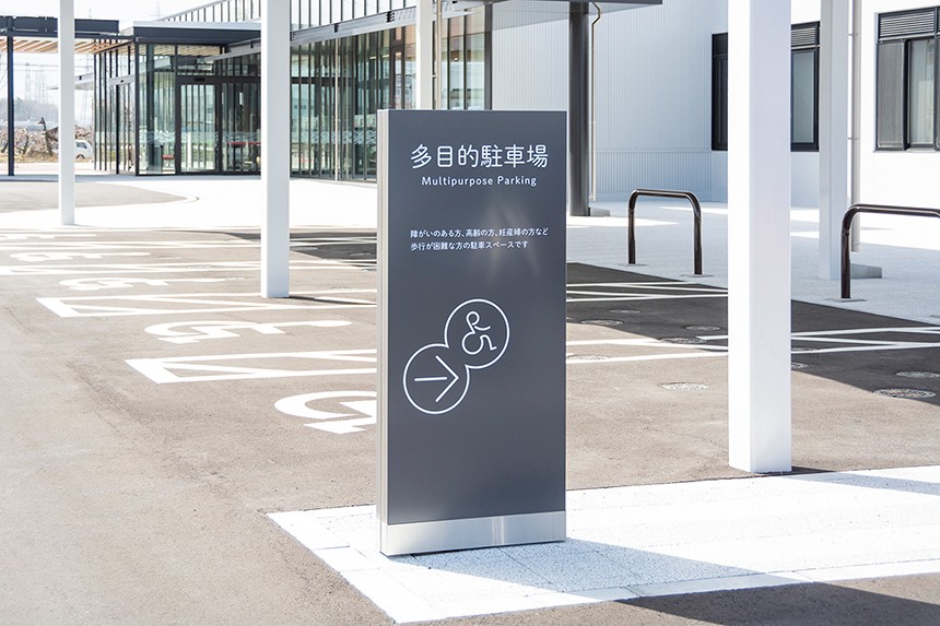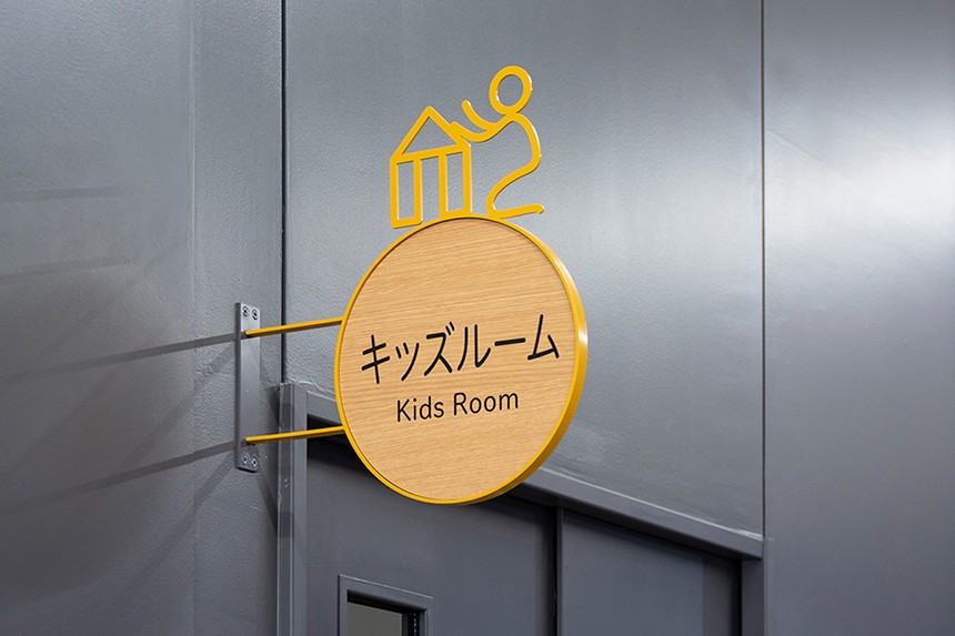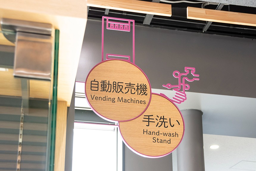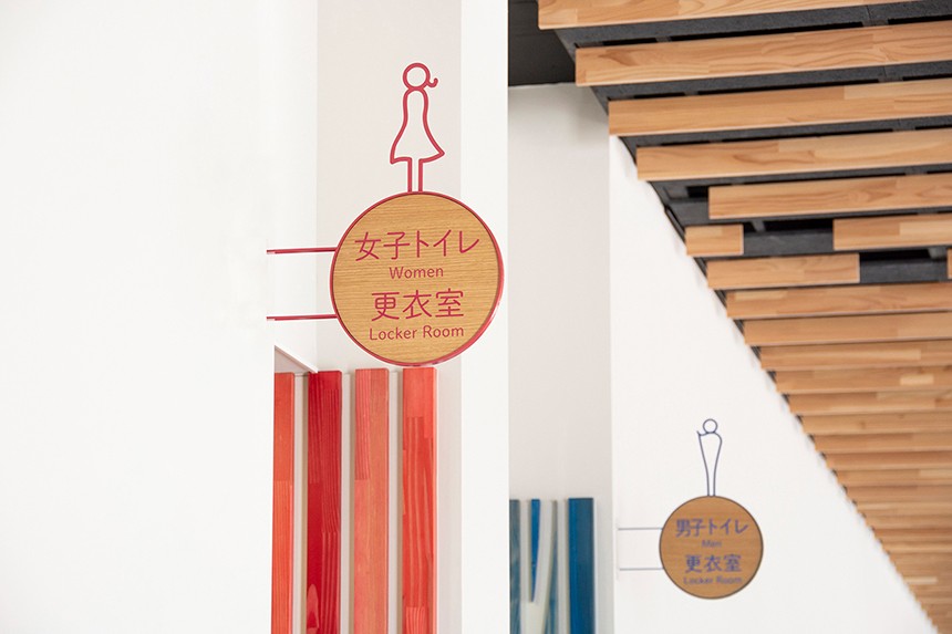 サインには、オリジナルのピクトグラムを多く⽤いることで、利⽤者に分かりやすく、なおかつ空間を楽しく演出するデザインとしました。また、塩尻市の伝統産業である「⽊曽漆器」の技術によるプレートや、⽊材を活⽤するなど、地域の⽂化や⾵⼟の魅⼒を取り⼊れたサインとなっています。