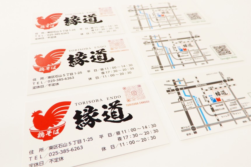 新潟市のラーメン店「鶏そば縁道」のロゴデザイン、店舗サイン、告知チラシの他、ショップカード、箸袋のデザイン・製作をお手伝いさせて頂きました。
