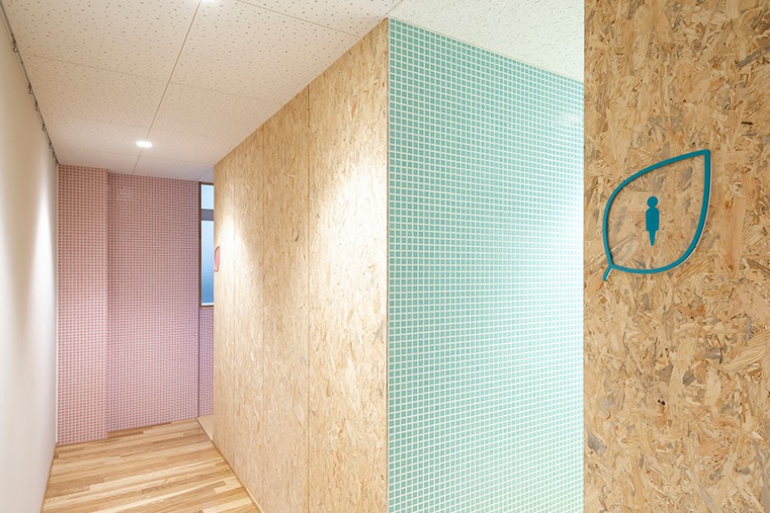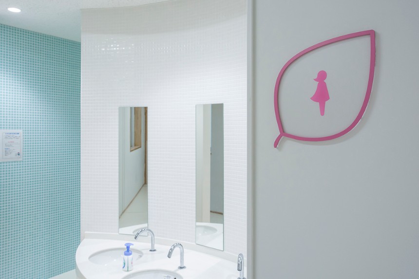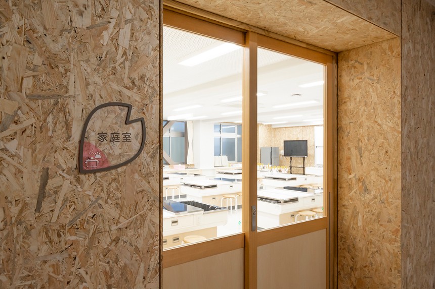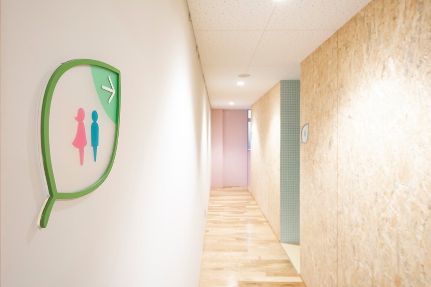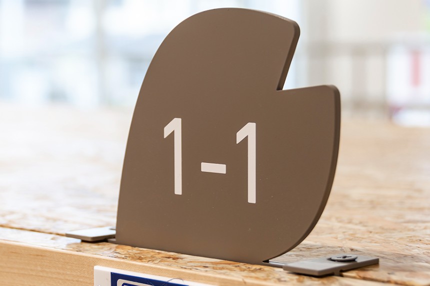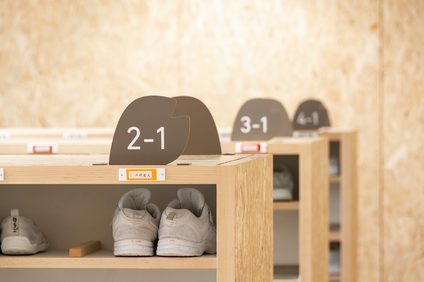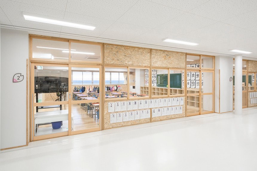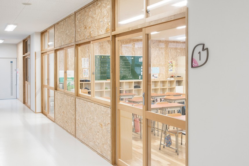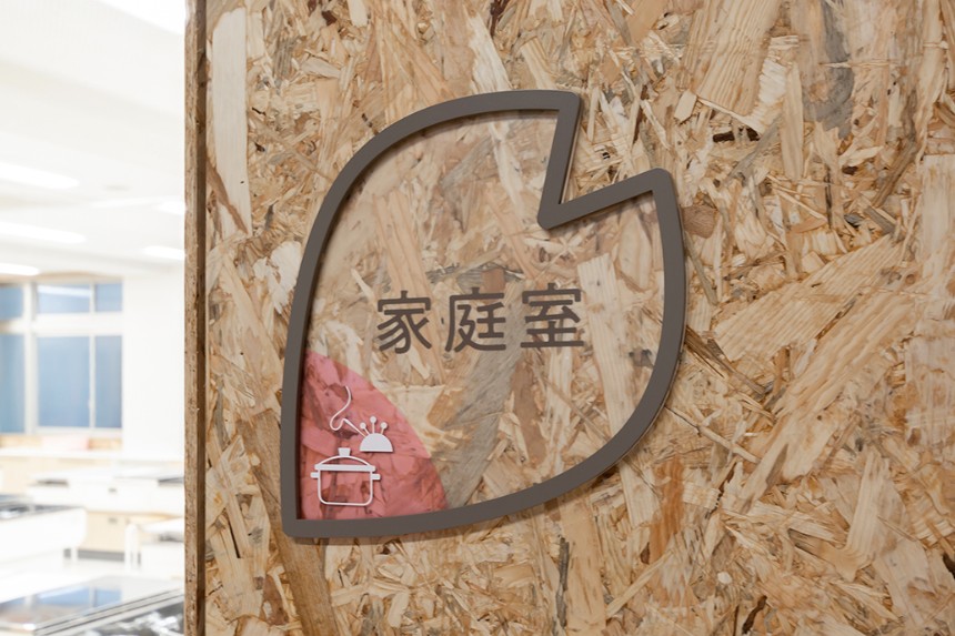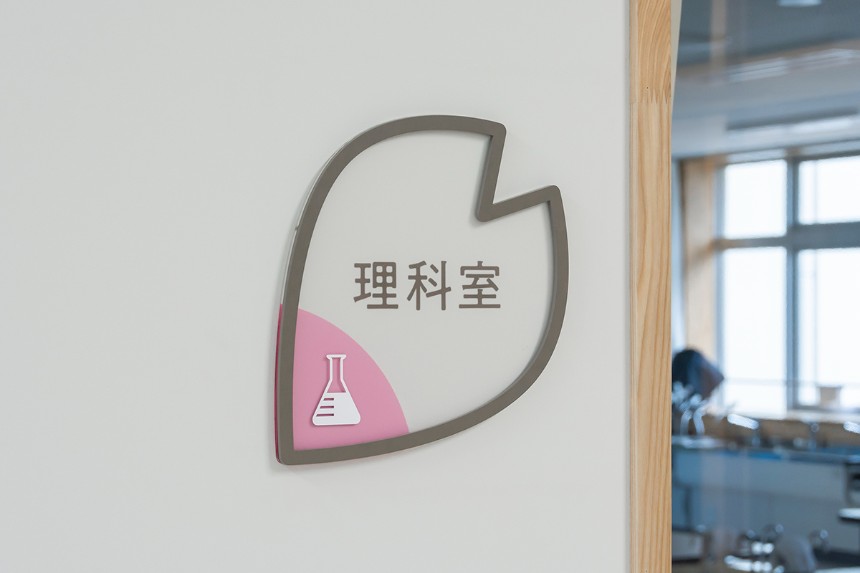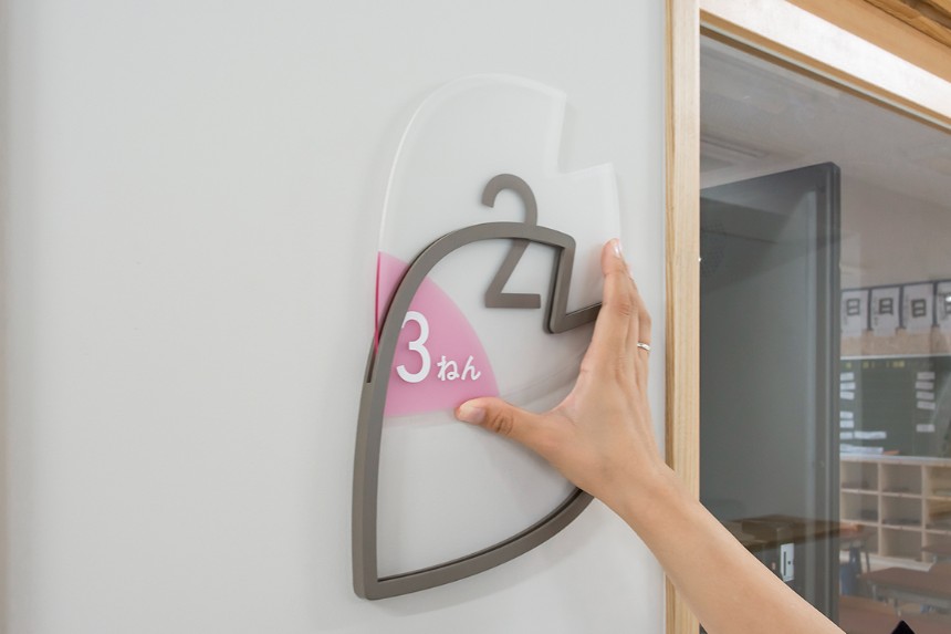 かほく市の木であり、校章のモチーフにもなっている桜を、サイン全体のデザインにも取り入れました。透明素材を用いることにより、白だけではなく木材も使用されている校舎の空間全体と自然に馴染むサインとなっています。クラスの変更に応じて簡単に入れ替えることができる仕組みは、年度によって教室の位置やクラス数が変わりやすい小学校という施設に対して実用的な効果をもたらしています。