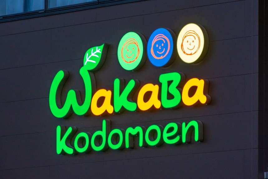外部にはLED内照式サインが2つあり、周囲の住宅街との調和を保ちながら、明るく活気のあるこども園を象徴しています。