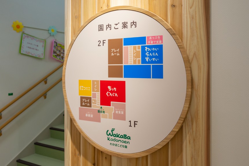 昭和51年に開園したわかばこども園の改築工事が行われ、当社ではサイン計画から施工までをお手伝いさせていただきました。
