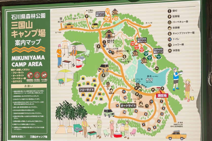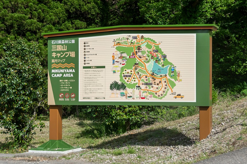 石川県河北郡津幡町に位置する、豊かな森林に囲まれた三国山キャンプ場の場内サイン改修をお手伝いさせていただきました。