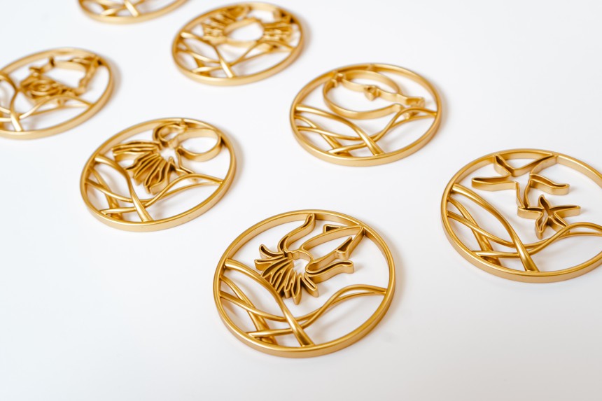 お食事処の各個室は、海の生き物をテーマにした室名になっており、それらの生き物が波と戯れる様子をデザイン化し3Dプリンターで立体的造形として仕上げました。また、ゲームラウンジは”明けてしまうのが惜しい夜”という意味の「可惜夜」から夜更けの美しい月を連想し、上品かつ存在感のあるデザインに仕上げています。