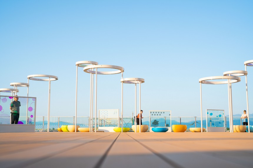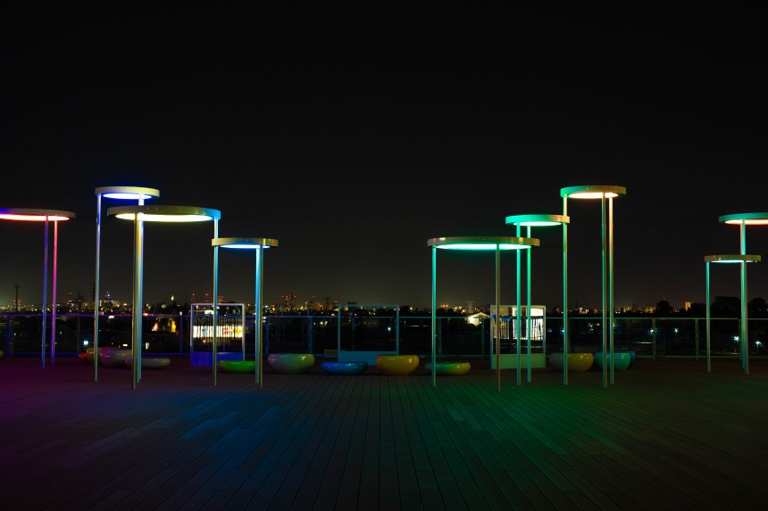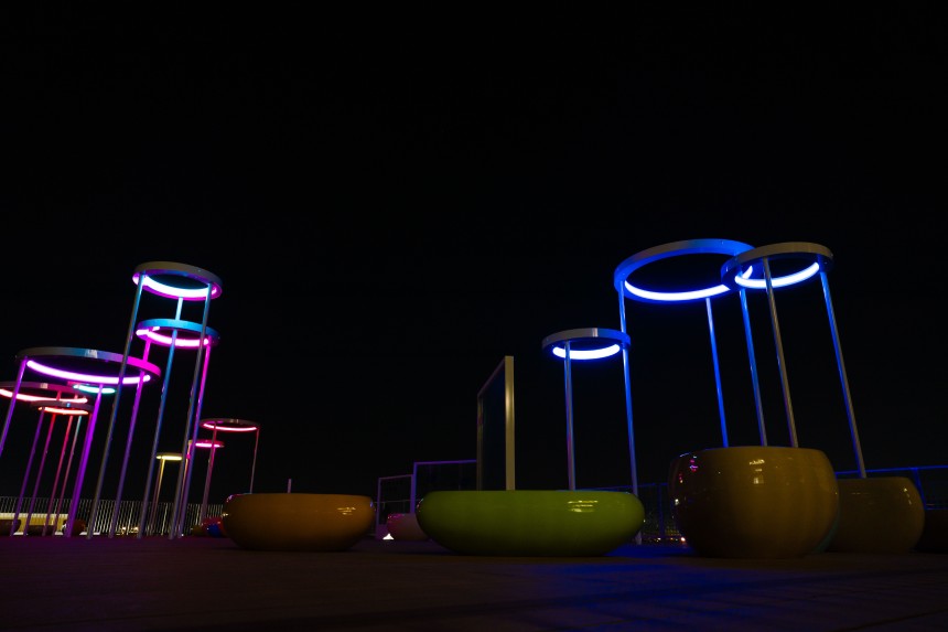 クレヨンで絵が描けるガラスのキャンバスは、合わせガラスの中間膜に印刷を施したものと、七色に反射する特殊なフィルムを内側に貼ったものを使い分け、日照により様々な表情を楽しめるようにしました。種をモチーフにしたベンチはFRPで造形、光のモニュメントはリングの内側にLEDを内蔵し、床下に配置したコントローラーによってさまざまな色の変化を楽しめます。