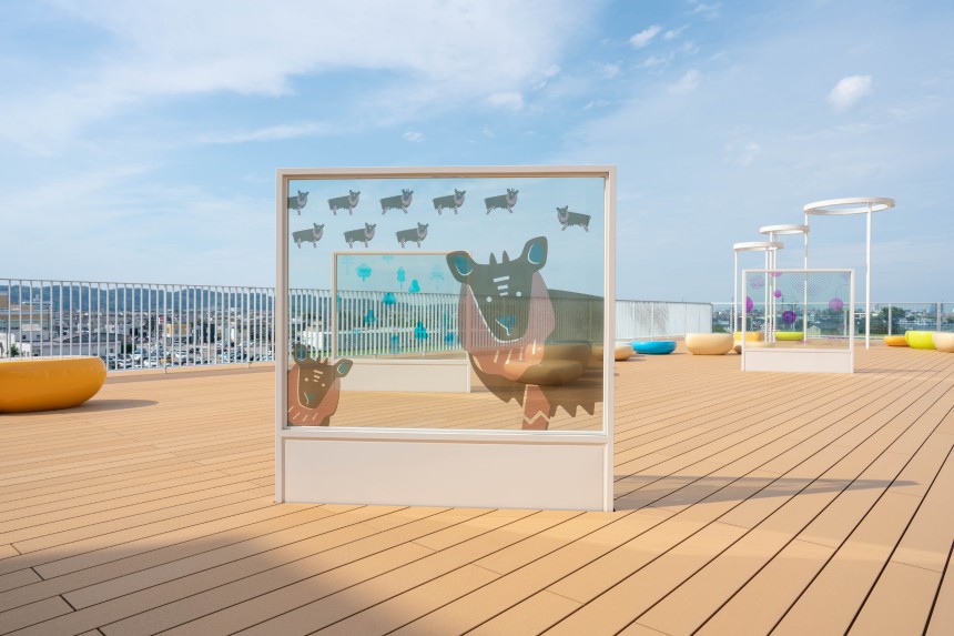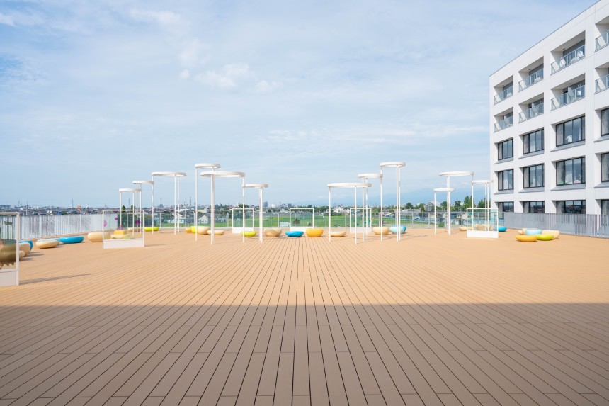 富山西総合病院様北棟増築に伴う、3階屋上庭園に設置されたオブジェ。富山大学芸術文化学部の学生さんがコンセプトからデザインまで手掛けられ、弊社は設計から携わらせていただきました。
