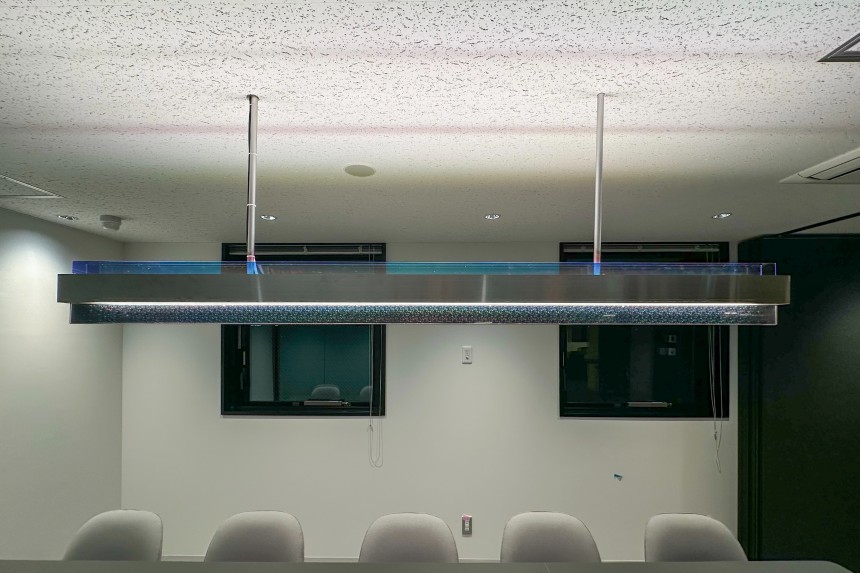 山岸建築設計事務所様監修のもとでブレイズデザイン様と共に、カタニ産業様の群馬支店に納めるオリジナル照明をデザイン・製作させていただきました。本体の仕上げにはカタニ産業様の製品を使用しており、オリジナリティあふれるデザインとなっています。会議室に吊るされた照明器具は「ホットスタンピング箔」という製品が使用されており、見る角度や照明の当たり方により見え方が変わる幻想的な印象を与えます。それらとステンレス材で構成された本体が組み合わさることにより、先進的なデザインとなりました。