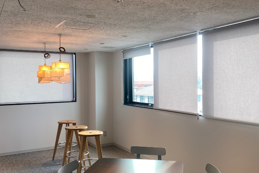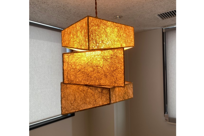 また、社員用ラウンジには「スパイラルヤーン」という金銀糸をシート状に仕上げた製品を使用し、3mmの細いフレームにそれらを貼り込んだ幾何学的なペンダントシェードとして仕上げました。背面から光を受けることで、スパイラルヤーンが持つ特徴をより分かりやすく、より魅力的に見せるデザインとしています。