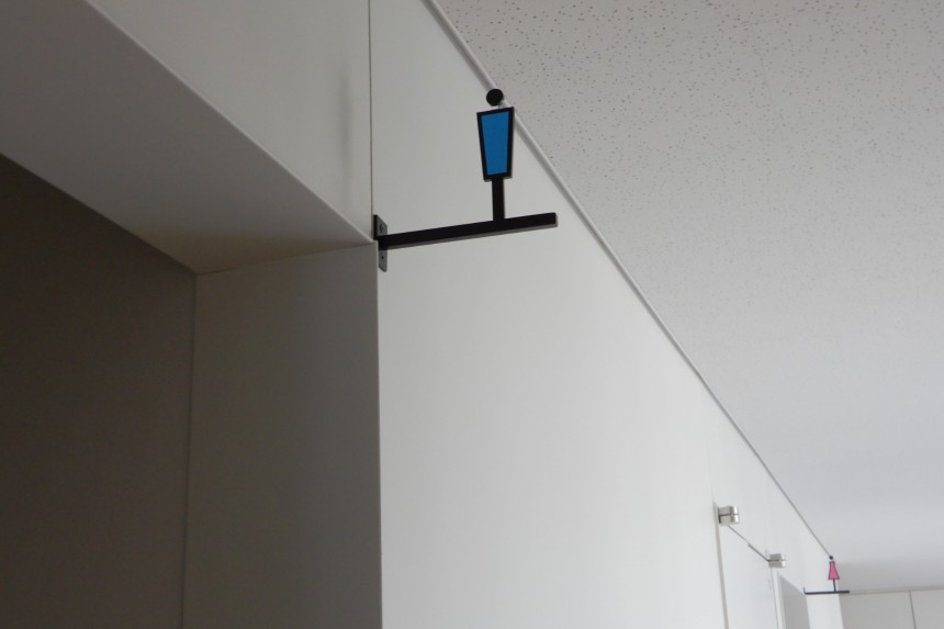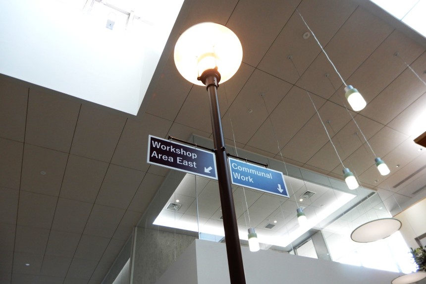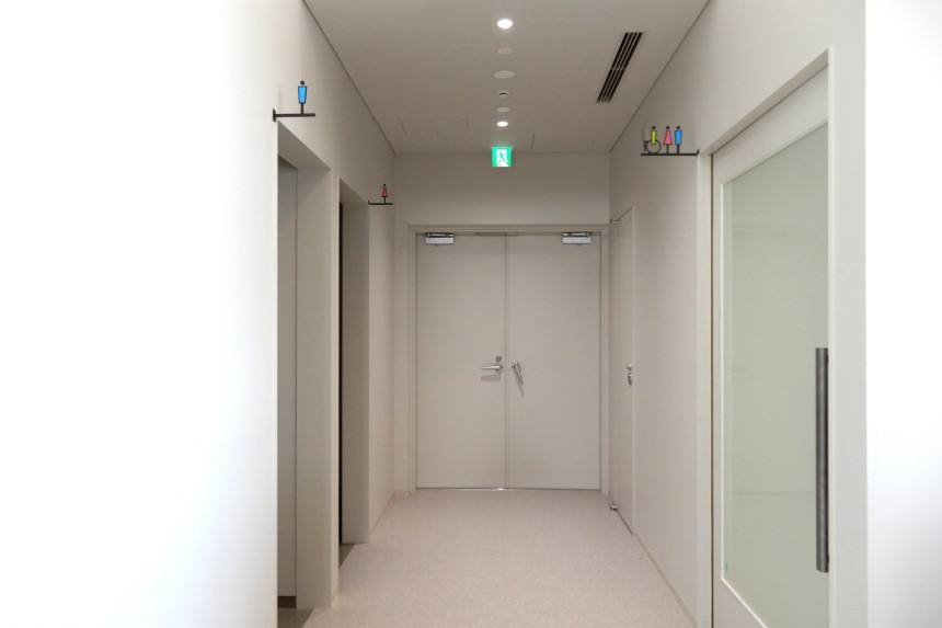 この3色を内部サイン各所に取り入れながらデザインし、次の100年に向けての決意と