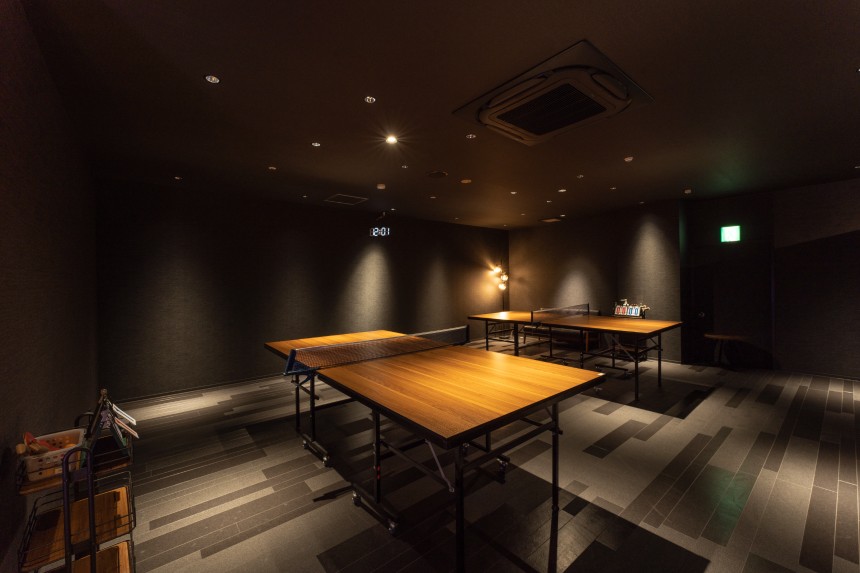 エンタメスペースは「リラックスゾーンとエンジョイゾーンの配置による温泉エンターテインメントの創出。おしゃレトロな空間によるどこか懐かしい情緒と現代的空間の融合」をコンセプトとし、防⾳壁で⾳を気にせずに盛り上がれる卓球コーナーと、炬燵やヨギボーを設置したリラックスコーナーを設けています。