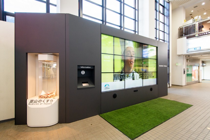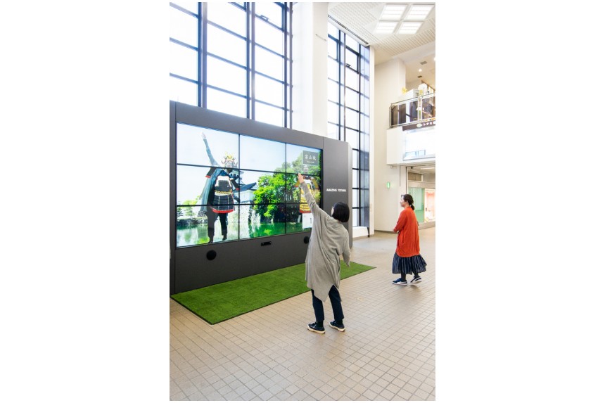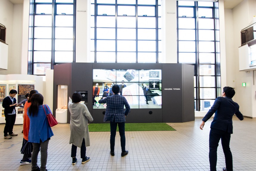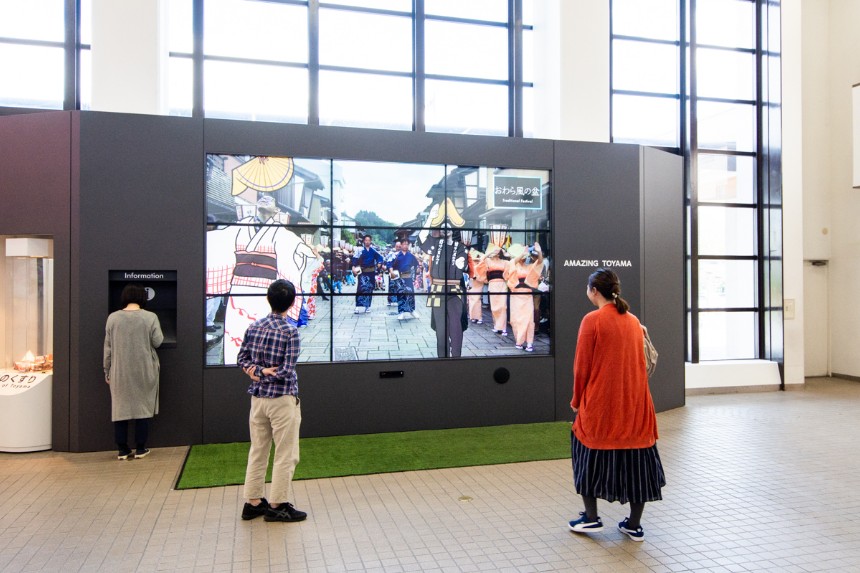 富山きときと空港の1階ロビーにある富山市コーナーに設置した9面マルチディスプレイを備えたデジタルメディアスペース。