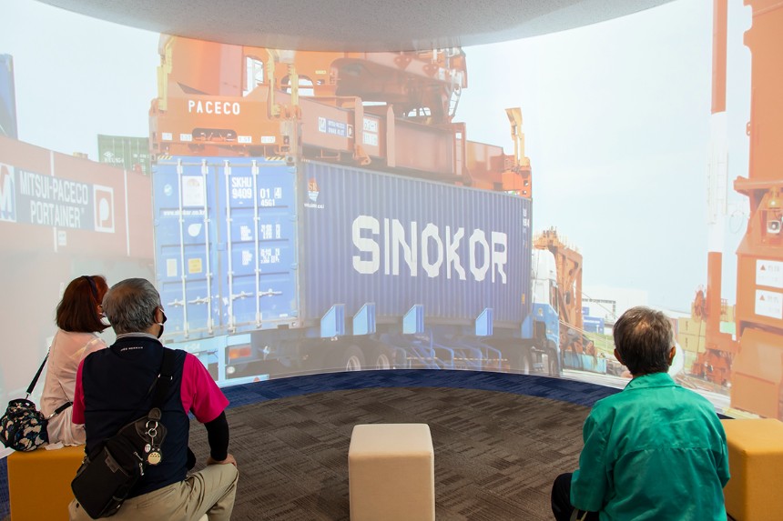 3台のプロジェクターを用いたダイナミックな映像を楽しめる疑似体験シアターでは、日本を代表する大型クルーズ船「にっぽん丸」に乗船してクルーズの旅を疑似体験できる「クルーズ船探検」、コンテナの積み下ろしに使うガントリークレーンのオペレーターを疑似体験できる「ガントリークレーン積み込み作業」、世界的な建設機械メーカーであるコマツの粟津工場で建機が生産されて金沢港から出荷されるまでを疑似体験できる「世界へ出荷される製品の旅」の3つのコンテンツを楽しむことができます。
