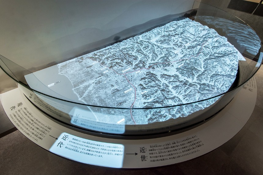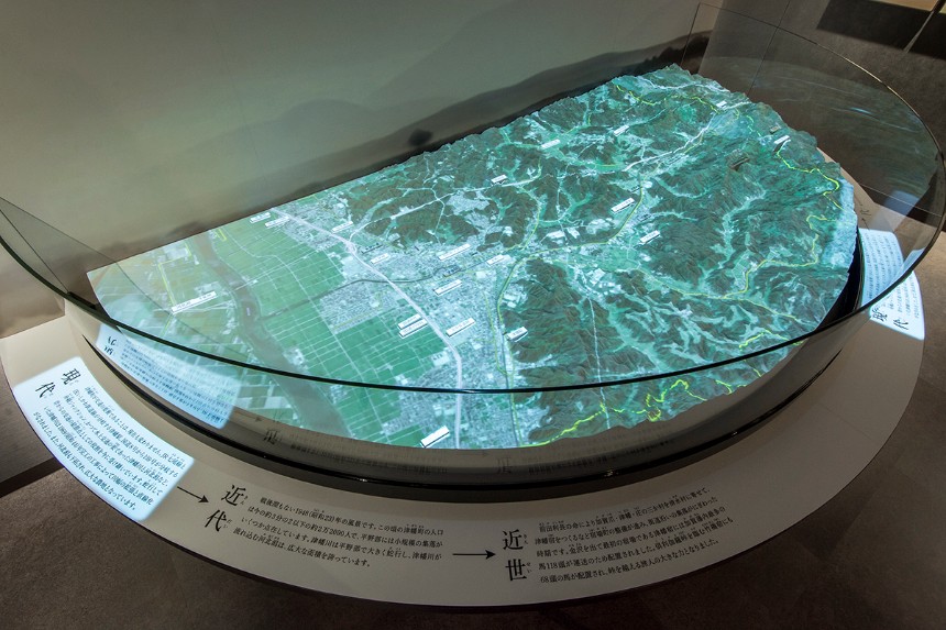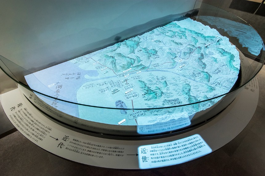白い地形ジオラマに、近世の絵図や近代、現代の航空写真の映像をプロジェクターで投影して、津幡町の交通の移り変わりを紹介しています。