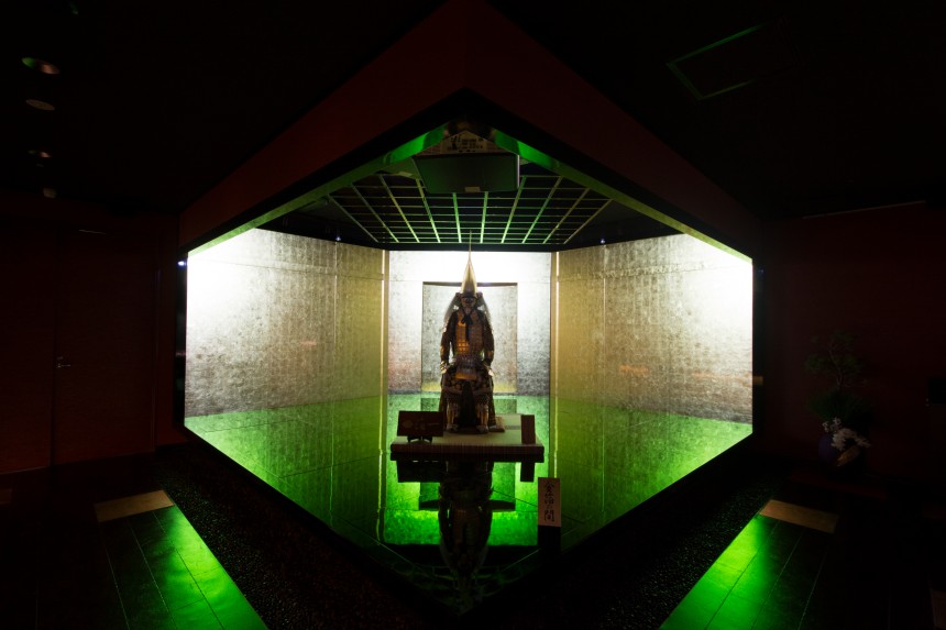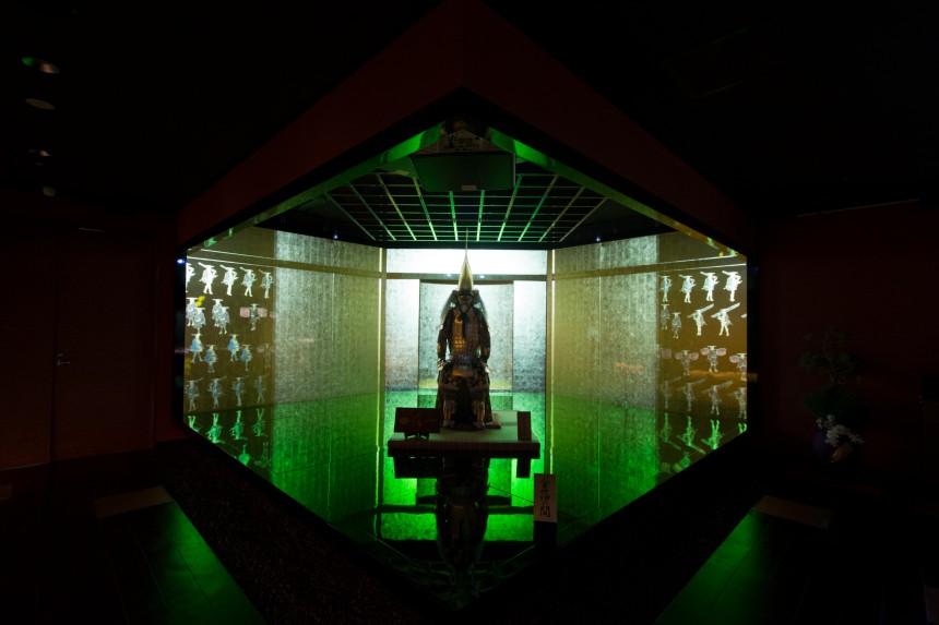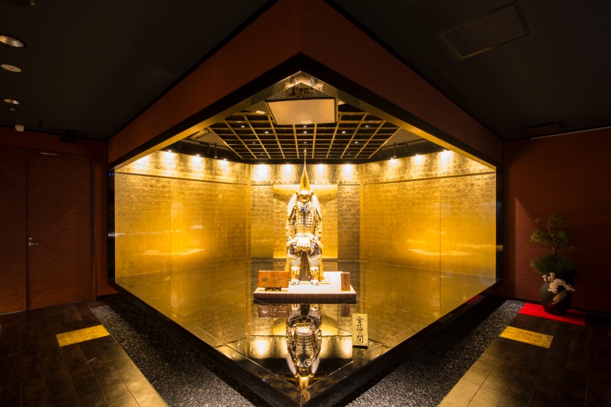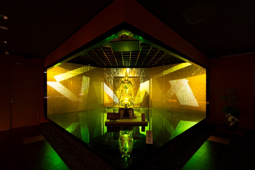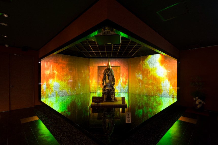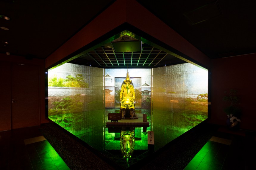 1万枚以上の金箔を貼りめぐらせた「金箔の間」と、その空間に鎮座する加賀藩初代藩主前田利家公が所蔵していた鎧兜を復元した黄金の鎧兜に、利家公が金沢城に入場するまでの物語を映像で投影。金箔と光が織り成す幻想的なプロジェクションマッピングになっています。