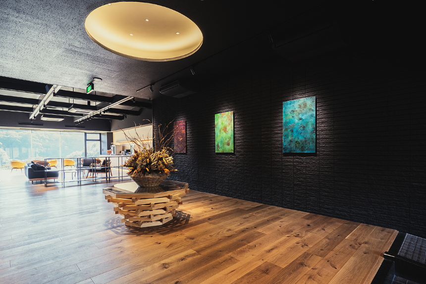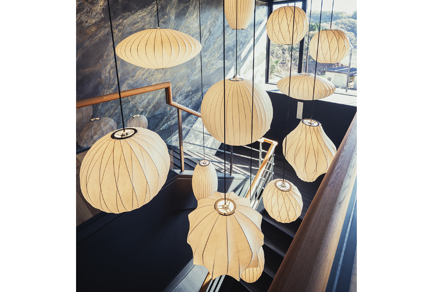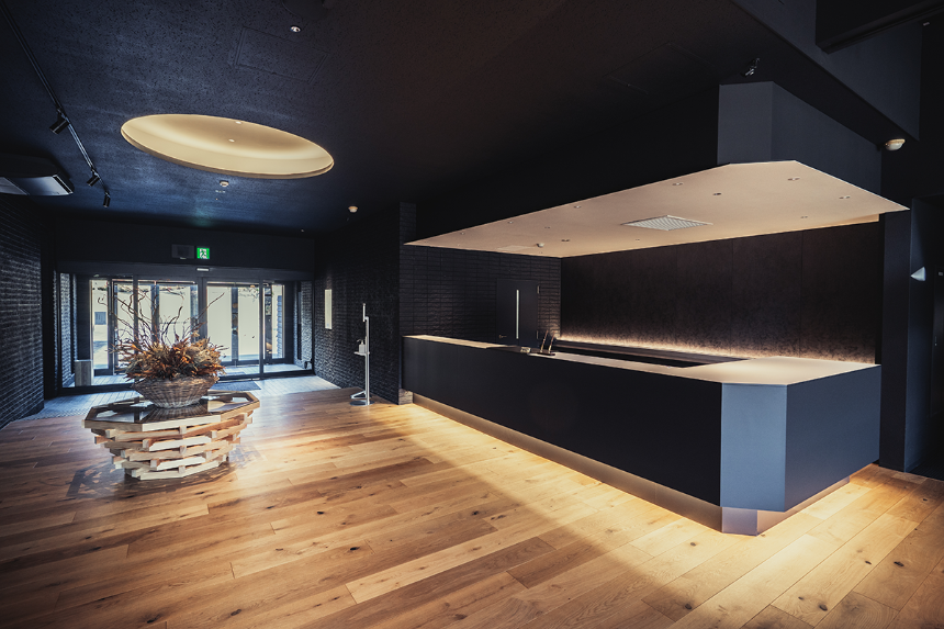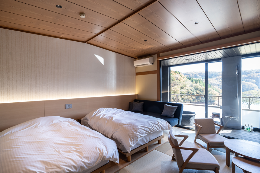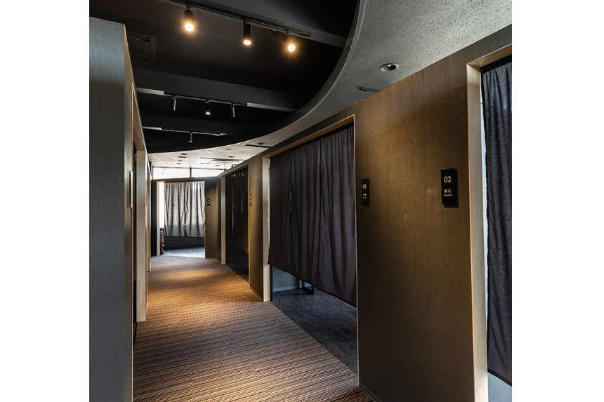 内装は黒を基調とし、景観を引き立てる落ち着いた空間構成としています。全客室に半露天風呂を設け、天然温泉に浸かりながら自然を楽しめる滞在を実現しました。また、富山の職人による特殊左官や、高岡の着色銅板アート、福岡町の菅笠をモチーフにした照明などを取り入れ、地域の文化や歴史を感じられる空間としています。