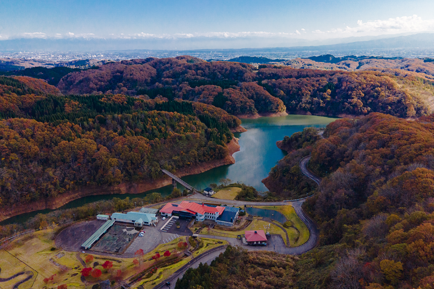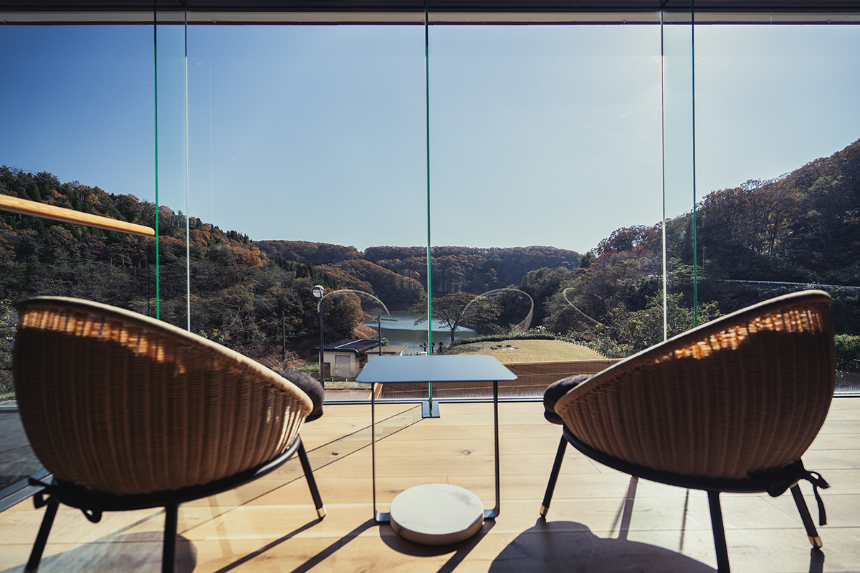 赤い屋根が印象的な外観は大きく変えず、ロビー・客室・レストランなど内部空間を中心に現代的なデザインへ刷新しています。山中の五位ダム湖畔という立地を生かし、ロビーや客室からは湖と四季折々の自然を一望できる計画としました。